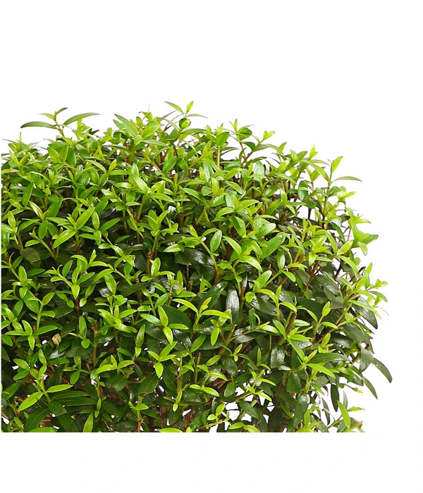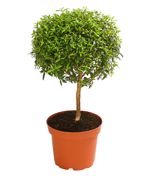 Ihre ursprüngliche Heimat ist der Mittelmeerraum, wo sie als immergrüner, stark verzweigter Strauch Höhen von 2 – 3 m erreichen kann. Bei uns wird die Brautmyrte, die auch als Echte oder Gemeine Myrte bekannt ist, als dekorative Kübelpflanze geschätzt, die ihr mediterranes Flair auf Terrassen und Balkonen verbreitet. Die Pflanze hat eine Fülle kleiner, dunkelgrüner, spitz zulaufender Blätter, die beim Zerreiben den typisch aromatischen Duft verströmen. Der schönste Schmuck aber sind die weißen Blüten, die den Sommer über, von Juni bis Oktober, wie lustige Schneeflocken zwischen dem grünen Blattwerk leuchten. Das Faszinierende an der Brautmyrte, die wir Ihnen hier als dekoratives Stämmchen anbieten, sind die zahlreichen Legenden, die sich um die Pflanze ranken. Im Altertum soll die Myrte Aphrodite geschmückt haben, auch bei den schönen Ägypterinnen war sie überaus beliebt. In unserem Kulturkreis wurde die Myrte lange als traditioneller Hochzeitsschmuck verwendet, weil sie als Symbol für Fruchtbarkeit, aber auch für Keuschheit und Reinheit galt.