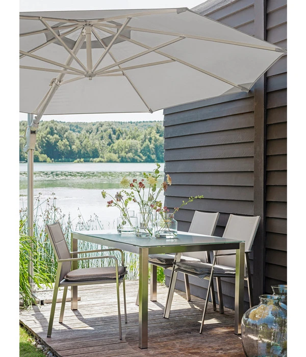 Unter dem Dehner Ampelschirm Zypern können Sie und Ihre Familie viele Stunden unbeschwert im Freien verbringen, denn er ist mit einem exzellenten UV-Schutzfaktor von 80+ ausgestattet. Allerdings ist jede Haut unterschiedlich empfindlich, so dass wir empfehlen, zarte Kinderhaut unbedingt zusätzlich mit einer guten Creme und entsprechender Kleidung schützen.