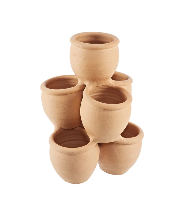 Nicht ohne Grund genießen schon seit Jahrhunderten die schönsten Pflanzen die positiven Eigenschaften dieses natürlichen Materials. Denn Terrakotta hat winzige Poren, in denen der Topf Feuchtigkeit speichert und diese langsam an das Erdreich abgibt und auf diese Weise für ein gutes Topfklima sorgt. Nur ein echter Terrakotta-Topf kann Ihren Pflanzen auf diese natürliche Weise ein gleichbleibendes Klima bieten. Die wasserspeichernde Funktion ist gleichzeitig aber auch der Grund dafür, dass die Terrakotta Kräuter-Etagere für den Garten in der kalten Jahreszeit in einen frostsicheren Raum gehört. Wer diesen Punkt beachtet kann sich mit der Kräuter-Etagere für den Garten viele Jahre lang an Kräutern, Blumen und Erdbeeren darin erfreuen.