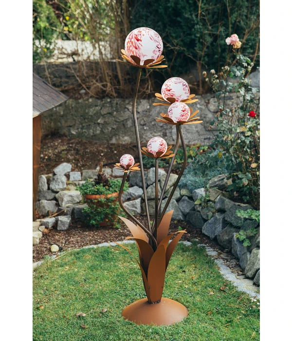 Sie haben einen Garten, den Sie gerne mit ins Auge springenden Zierobjekten der besonderen Art bestücken, um sich daran zu erfreuen? Da ist die imposante Metallskulptur Ferrum Metall-Blumenzauber mit Glaskugeln ein absolutes Highlight, das jeden Besucher zu begeisterten Kommentaren animiert. Das wundert auch nicht, ist der Metall-Blumenzauber mit Glaskugeln der Marke Ferrum mit seiner überwältigenden Präsenz doch ein Musterbeispiel der Deko-Kunst, dessen Anblick sich niemand entziehen kann. Sein außergewöhnliches Design in der wunderschönen Rost-Optik, von fünf kunstvollen Glaskugeln gekrönt, ist unglaublich.