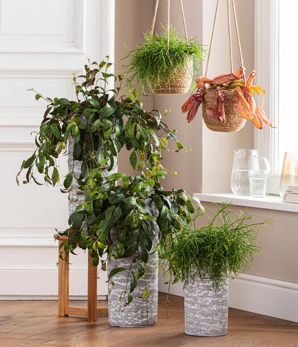 Gerne wird die Kannenpflanze ‘Miranda‘ in eine Hängeampel gesetzt, so dass sie ihre imposant langen, rot gesprenkelten Kannen dekorativ über den Rand herunterhängen lassen kann. Und sieht das schon bei einer Wuchshöhe von 40 cm toll aus, wird die Begeisterung noch größer werden, wenn die Nepenthes ihre Endgröße von 70 cm erreicht hat!